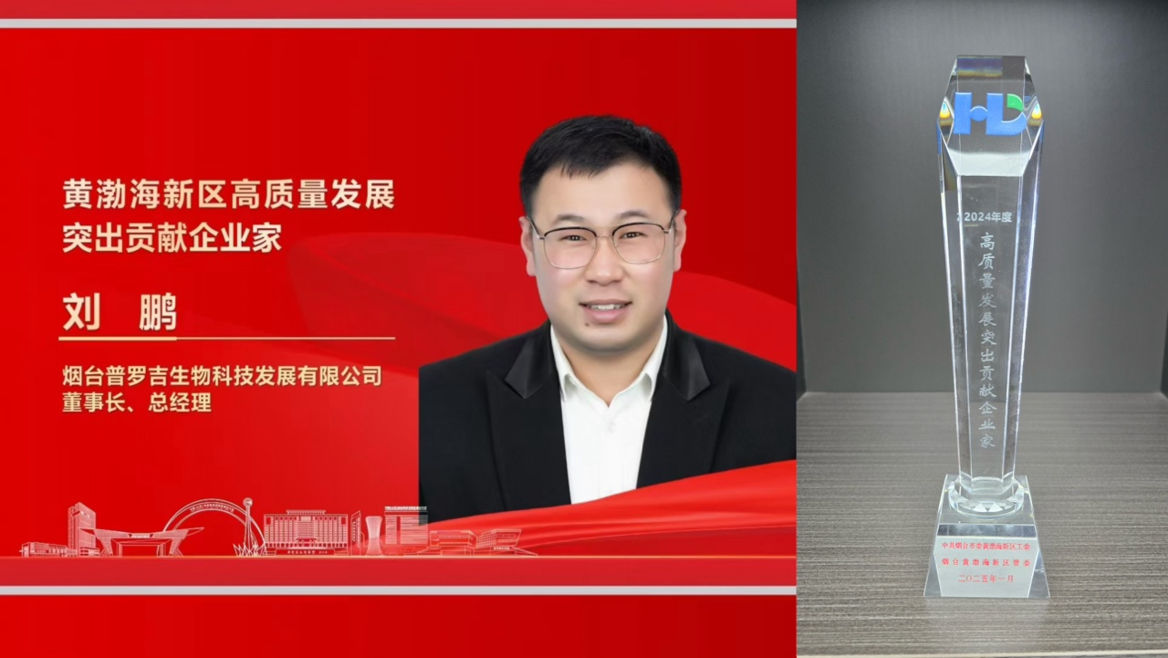 1月15日上午,煙臺黃渤海新區(qū)2024年經(jīng)濟工作會議在八角灣國際會展中心召開,會上隆重表彰了過去一年為全區(qū)發(fā)展做出突出貢獻(xiàn)的優(yōu)秀企業(yè)和企業(yè)家。煙臺普羅吉生物科技發(fā)展有限公司獲評“2024年度黃渤海新區(qū)高質(zhì)量發(fā)展突出貢獻(xiàn)企業(yè)(科技創(chuàng)新類)”,煙臺普羅吉生物科技發(fā)展有限公司董事長兼總經(jīng)理劉鵬先生被授予“2024年度黃渤海新區(qū)高質(zhì)量發(fā)展突出貢獻(xiàn)企業(yè)家”榮譽稱號。